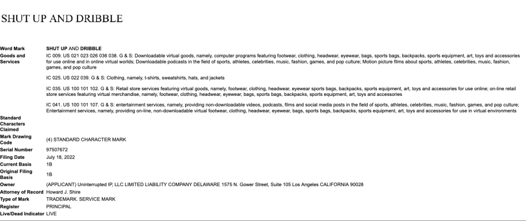 According to the USPTO, LeBron James’s company, Uninterrupted IP LLC. filed for the trademark “Shut Up and Dribble” on July 18, 2022.